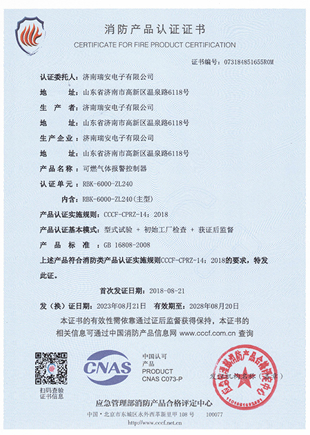 RBK-6000-ZL240氣體(tǐ)報(bào≥<)警控制(zhì)器(qì)消防産品認證證書(shū)