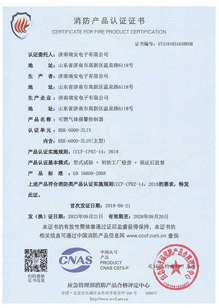 RBK-6000-Z1N氣體(tǐ)報(bà∑>o)警控制(zhì)器(qì)消防産品認證證書(shū)