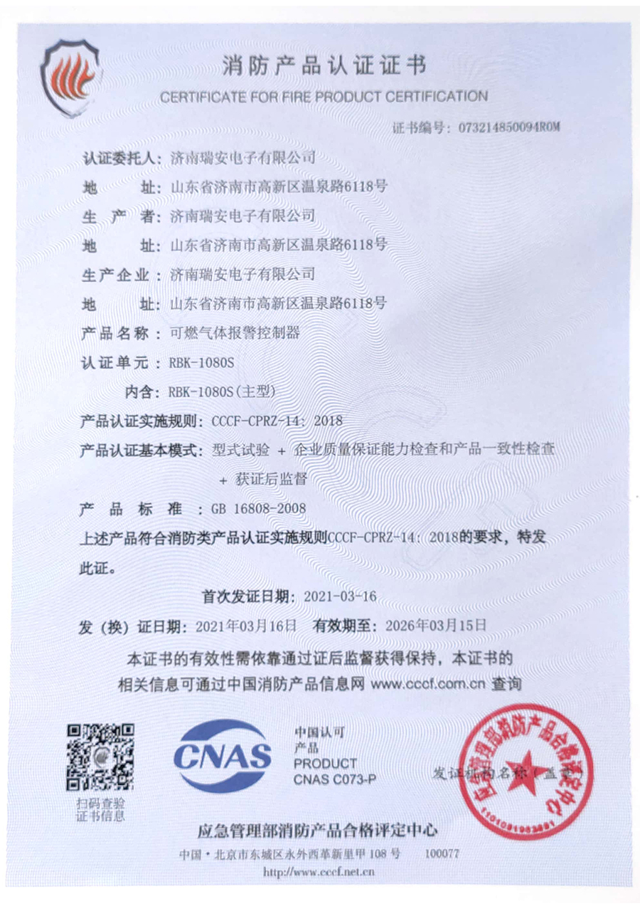RBK-1080S型氣體(tǐ)報(bào)•€警控制(zhì)器(qì)消防産品認證證書(shū)